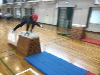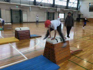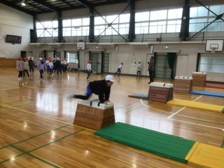 体育館に出された3段から7段までの跳び箱。自分で挑戦したい高さを選んで跳んでいます。綺麗に跳べたかどうか、友達がジャッジしています。