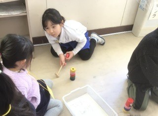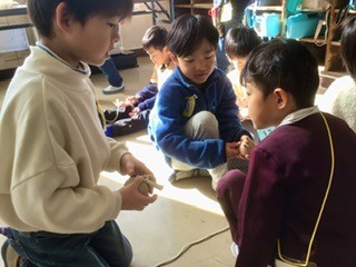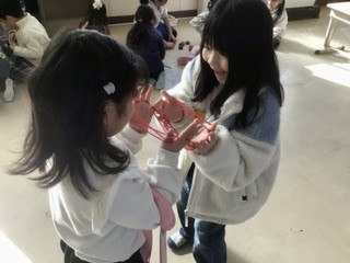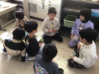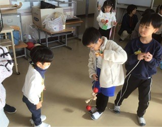 今日は、来年度加納小学校に入学する予定のこども園の子達と遊びました。遊びは地域の方に教えていただいた、けん玉やあやとり、お手玉やメンコなどです。1年生よりこども園の子の人数が多い大変な状況でしたが、みんなが楽しんでもらえるように頑張っていました。