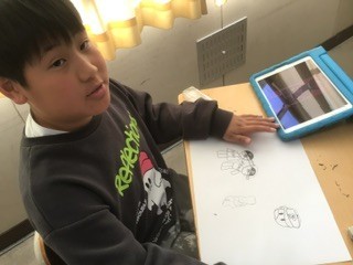 図工の時間です。2組は「〇〇の世界」として、版画の下絵に取り組んでいます。学習用タブレットを活用しながらイメージを膨らませて、用紙いっぱいに自分の世界を描いています。