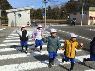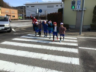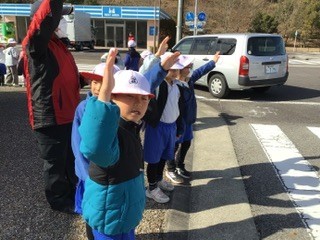 1年生は横断歩道の渡り方を学習しました。しっかりと手を挙げて、左右を確認してから渡っていきます。目で見るだけではなく、自動車が走ってくる音にも気をつけています。
