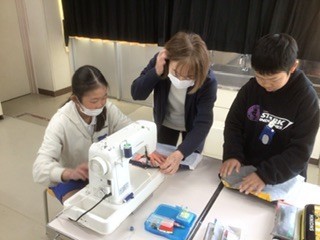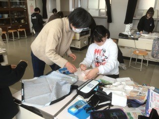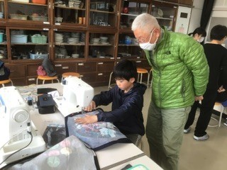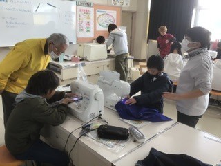 12日は1組、13日は2組がエプロンづくりを行いました。両日ともたくさんのミシンボランティアの方が来てくださり、丁寧に教えて下さいました。ミシンの調子が悪くなると、修理までも。地域の方の協力のおかげで、エプロンづくりがだいぶ進みました。ありがとうございます。