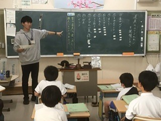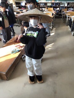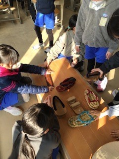国語で道具のうつりかわりについて調べ、発表をします。今日は豊田市博物館から借りてきた、編み笠やゲタ、炭火アイロンなどの古い道具を見て、どの道具について調べていこうか決めました。写真の前半は2組、後半は1組の様子です。