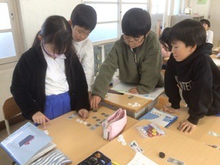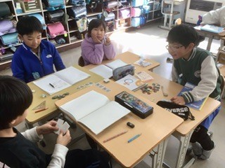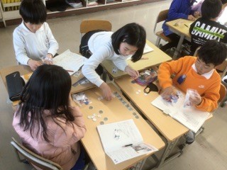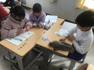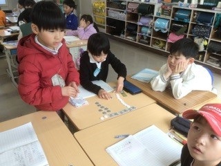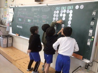 算数の時間です。算数セットのお金を使って、1000を超える数を勉強しています。練習問題として、3200は100を何個集めた数なのか、グループの友達と考えています。