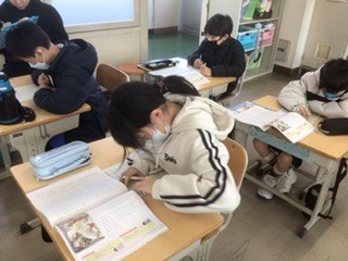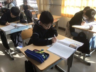 道徳の授業です。教科書の物語を読んで、本当の自由とは何かを考えました。難しい内容でしたが、積極的に発言をして、黒板にはたくさんの意見が書き込まれていました。