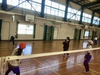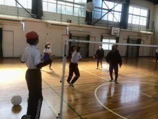 今日は「チーム全員がボールに触ってから相手コートに返す」というルールでゲームをしています。お互いに声をかけ合いながら、上手にボールを回しています。白熱したラリーが続いています。