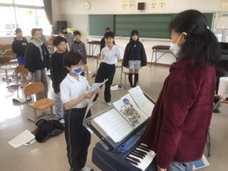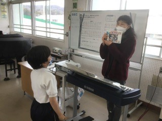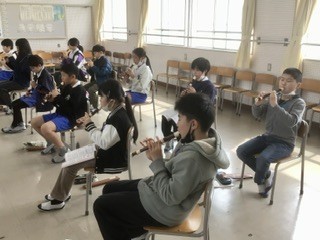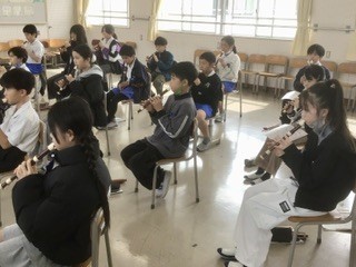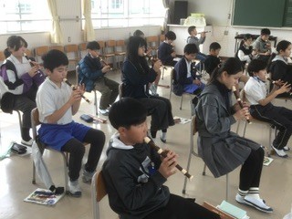 音楽室内に、リコーダーの「威風堂々」が綺麗に響いていました。今日は本年度最後の授業ということで、あいさつの後に手紙のプレゼントです。喜んでもらえました。