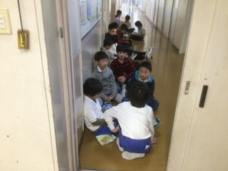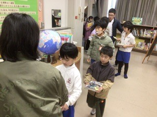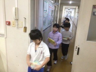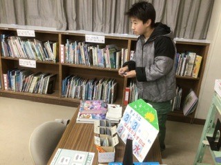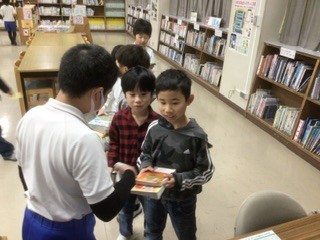 朝、たくさんの子たちが図書館前で開館を待っています。図書委員が準備を終えて戸を開けると、次々と返却や貸し出しの手続きに向かいました。本好きな加納っ子たちです。
