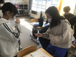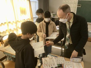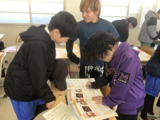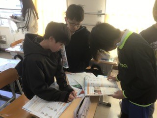 外国語の授業です。自分のヒーローを友達と紹介し合っています。2組のヒーローはfriends、mother 、father… 野球選手という人もいました。