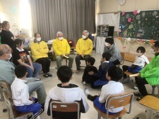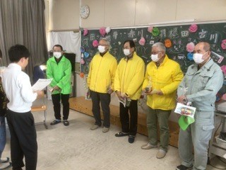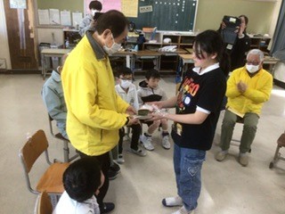野菜作りでお世話になった地域コーディネーターの方々と学校公務手さんを招いて、感謝の会を開きました。まずはハンドベルの演奏でお出迎えです。その後、記念撮影をしたり一緒にゲームをしたりして楽しみました。最後はプレゼントをお渡しして、感謝の言葉を伝えました。みんな笑顔の素敵な会になりました。