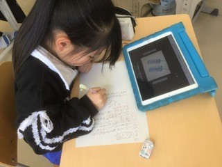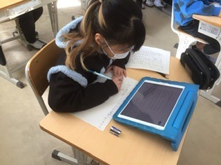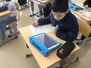 車椅子の人、外国の人、妊婦さん、耳が聞こえない人、目が見えない人、お年寄り…。町には色々な人がいます。みんなが困らないように過ごすためにどんな工夫がいるのか、学習用タブレットを使って調べています。