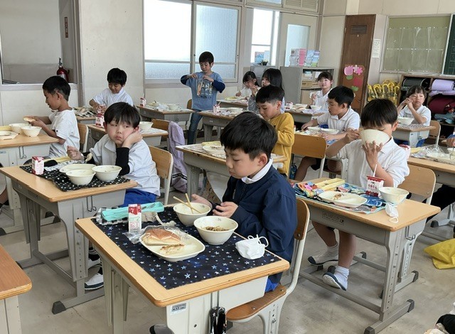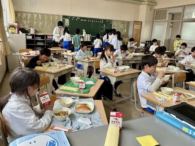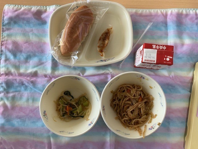 今日の給食は人気メニューの焼きそば、ぎょうざ、米粉パン、チンゲンサイの中華和え、牛乳です。3年生、美味しそうに食べています。