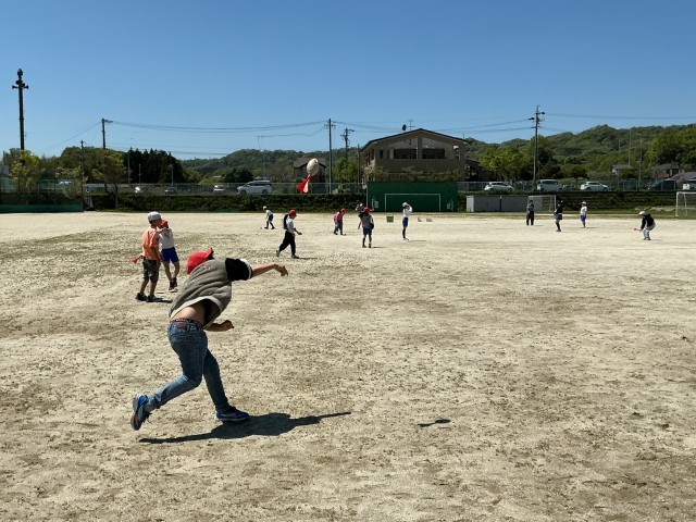 体力テストの種目にあるソフトボール投げの練習をしました。はじめにソフトボールで記録を測り、その後上手な投げ方をすると音が鳴るフォームロケットを使って練習しました。遠くまで投げられる子のフォームをお手本にしながら、どうやったら遠くまで投げられるのか試行錯誤して体の動かし方を学びました。