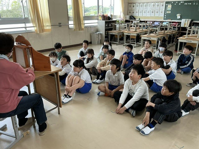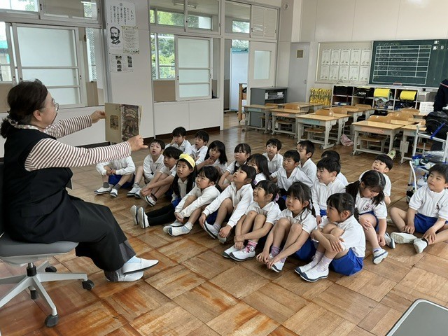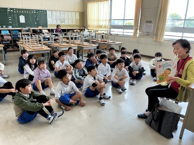 今年度も「さとの声」のみなさんに読み聞かせをしていただきます。初回の今日は全校での実施です。素敵な語り口に、みんな夢中になって聞いています。写真は1年生から3年生の様子です。