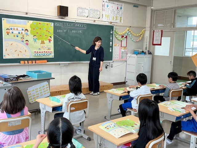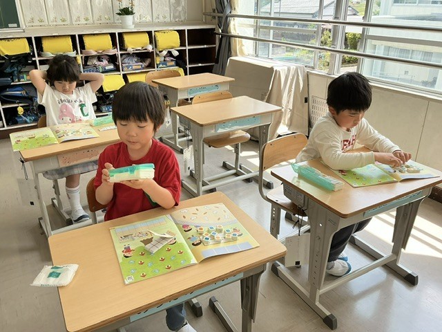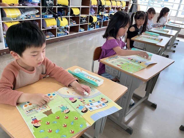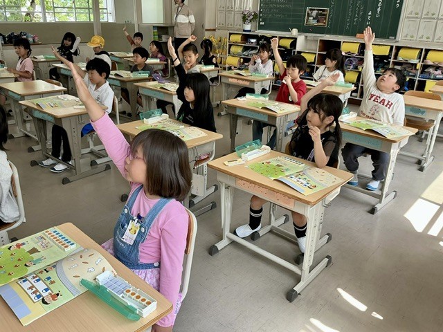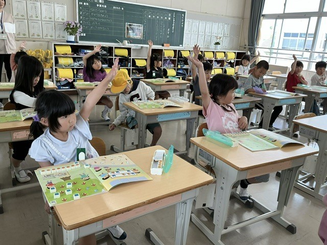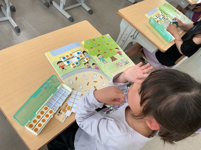 算数セットのブロックを使っての授業です。二つのもので、どちらがいくつ多いのかを考えています。手を挙げて発言する子もたくさんいます。