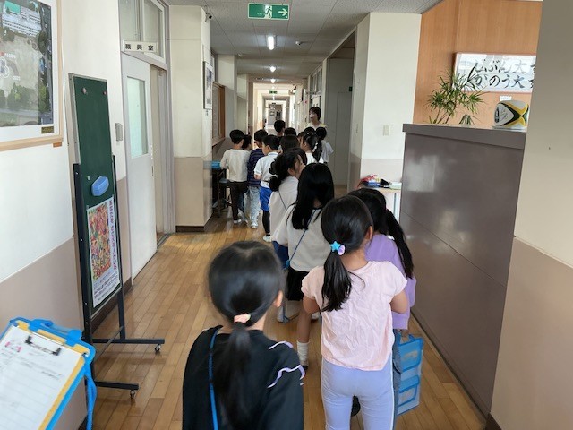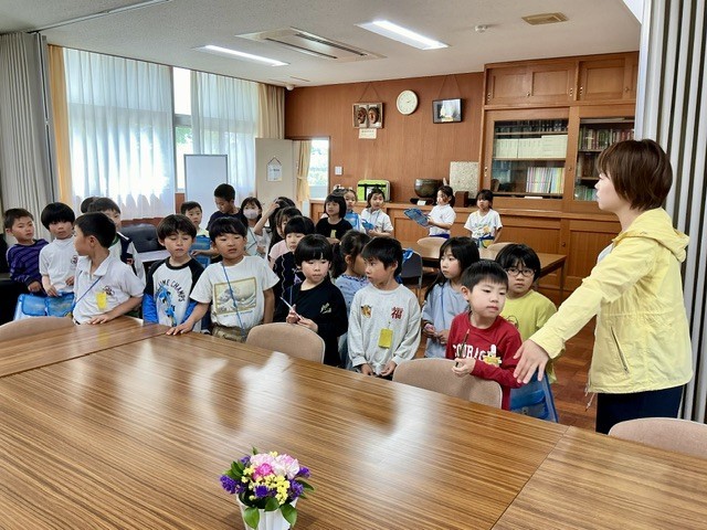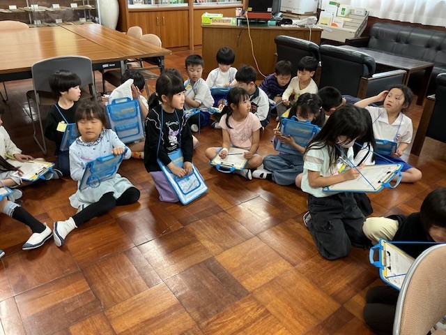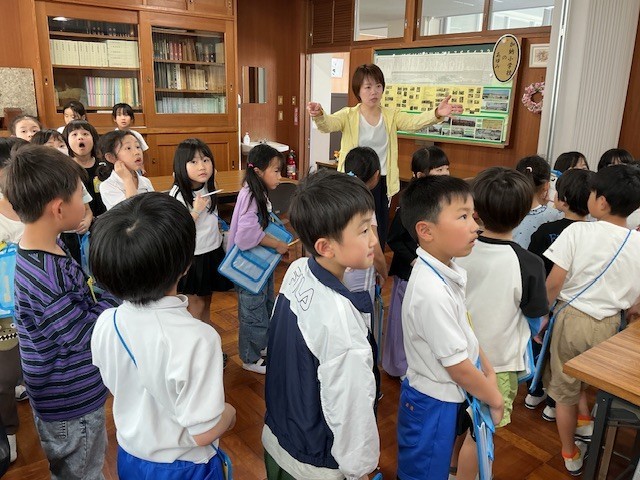 1年生と一緒に学校探検をする予定の2年生。今日はその下見として、職員室と校長室にやってきました。室内をよく見て、どんなことを紹介しようか考えています。