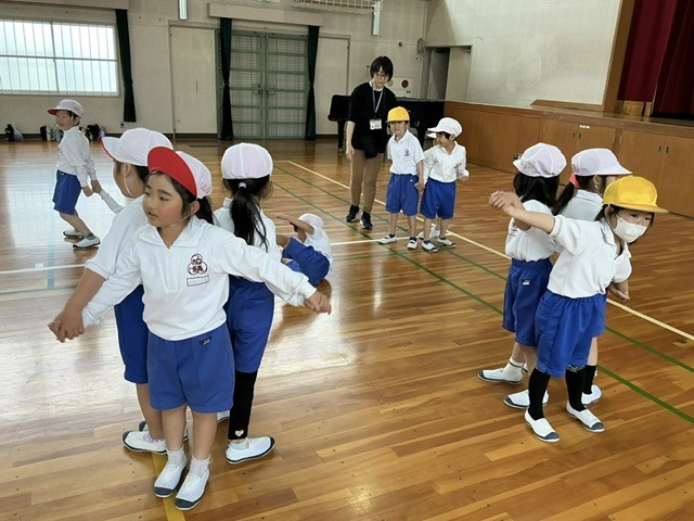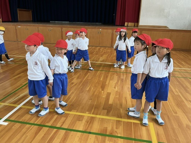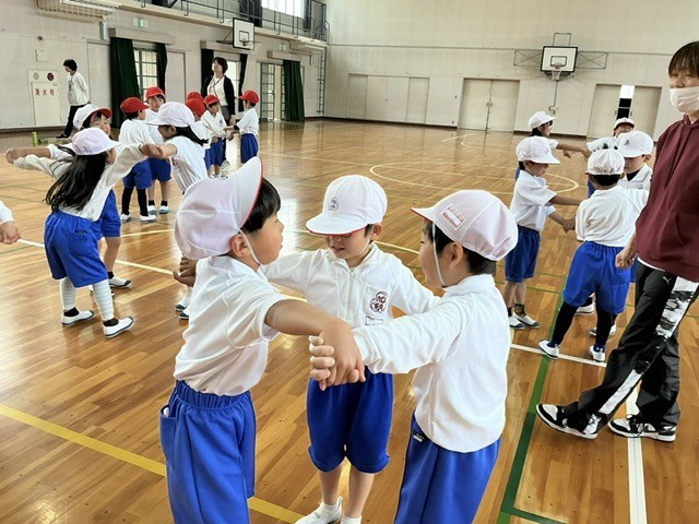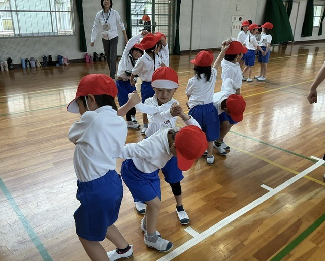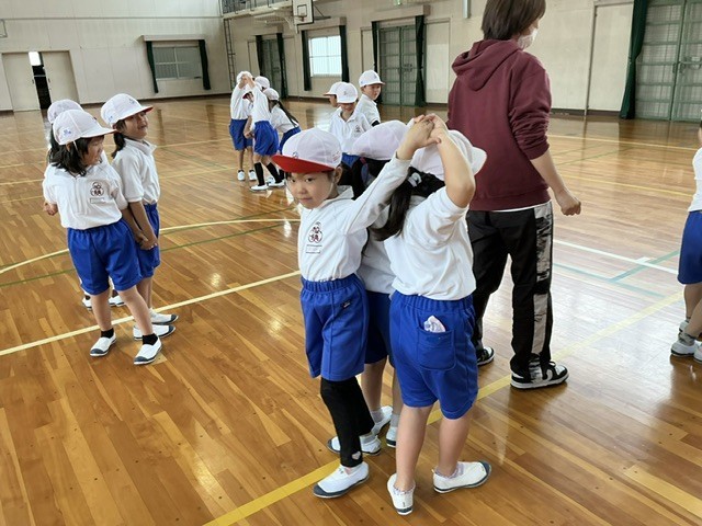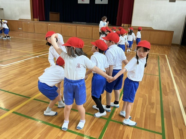 体育館で整列のしかた、体操の時の広がりかたを学習しました。準備体操のあとは、みんなで「なべなべ底抜け」に挑戦です。最初は2人組、次は3人、そして4人と人数が増えていくなか、どうやったら手を離さずにひっくり返ることができるのか、みんな考えながらやっています。