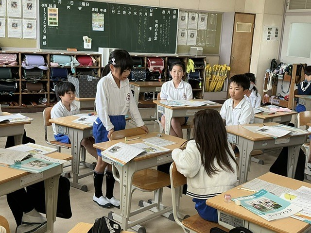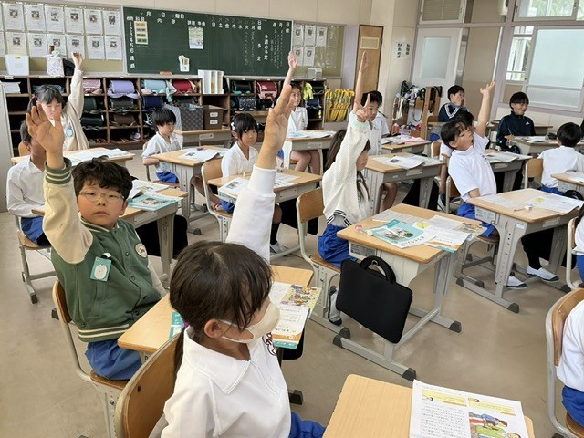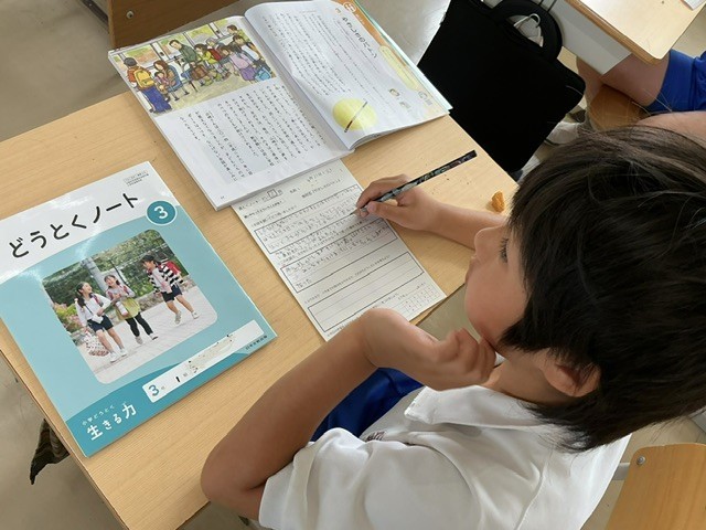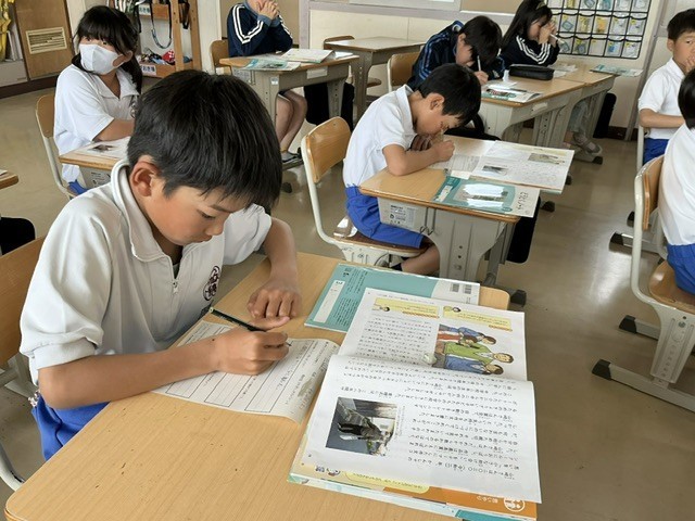 道徳の時間です。和歌山県の目の不自由な男性が、10年以上にわたり地元の小学生に助けられながらバス通勤を続けたという話を読んで考えました。お話を聞いてどう思ったのか、一番最初に手助けした女の子はなぜそうしたのか話し合いました。やさしさのバトン、素敵ですね。