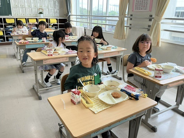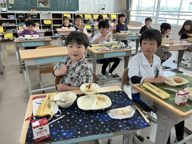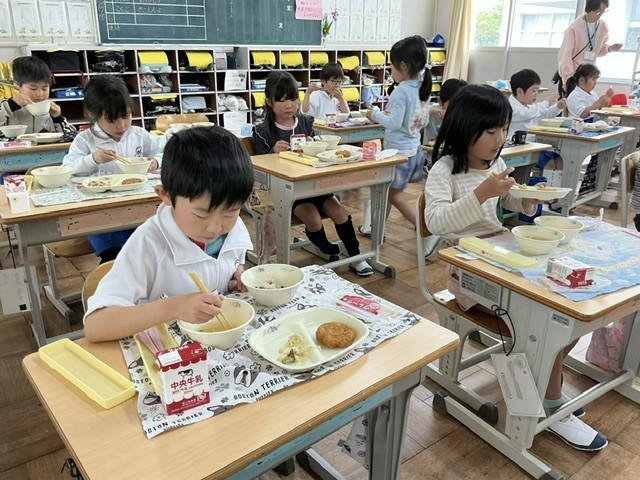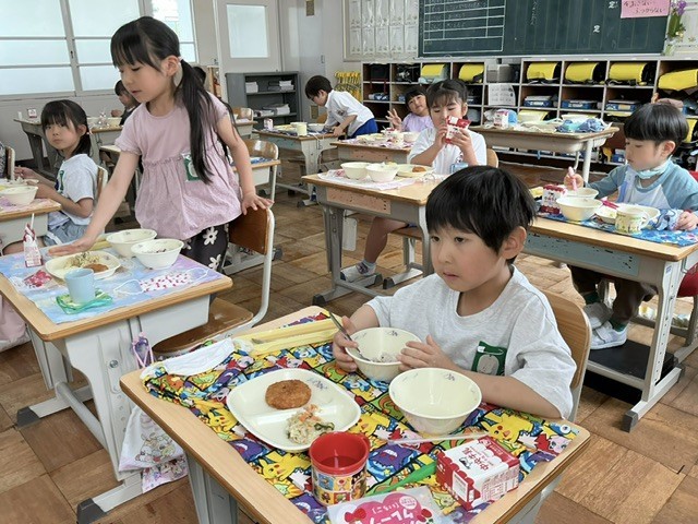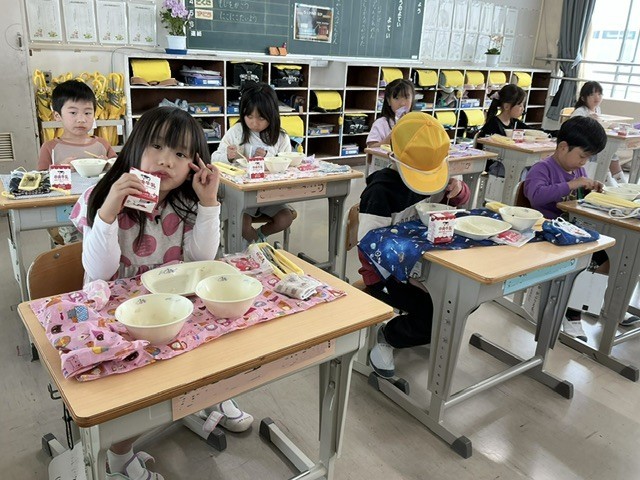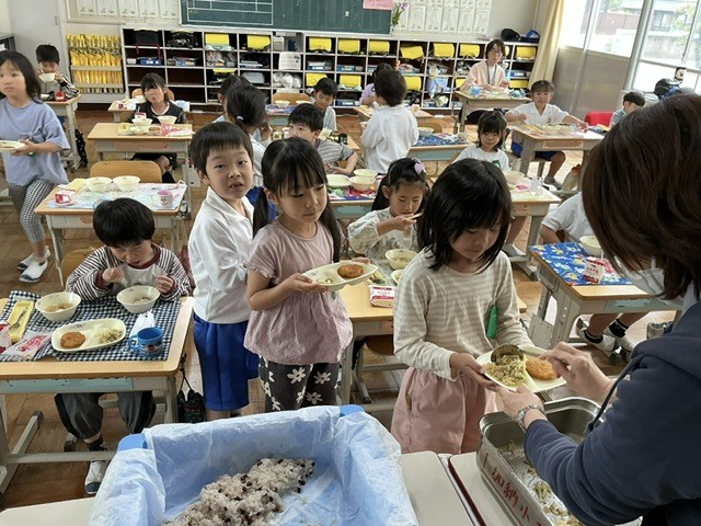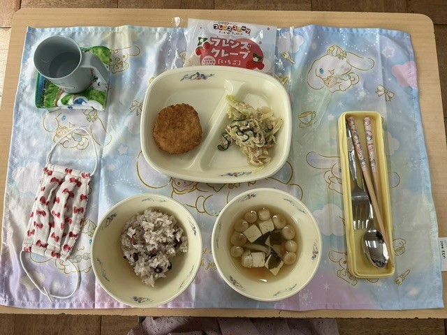 今日の給食は、入学と進級お祝い献立です。和風サラダ、海老カツ、赤飯、ふだま汁、いちごクレープ、牛乳です。1年生も美味しそうに食べています。