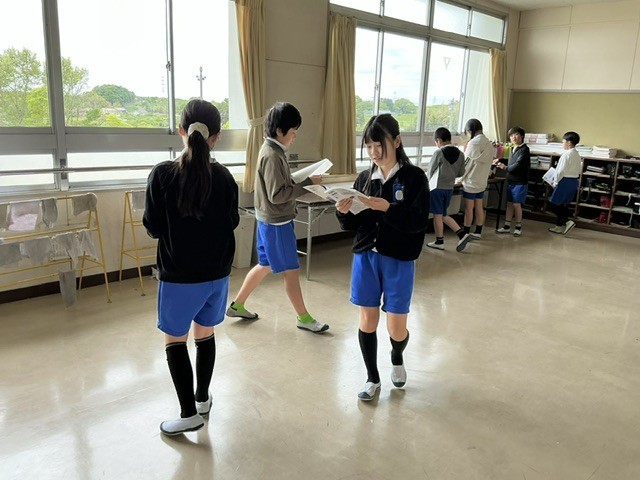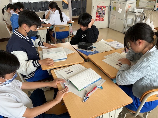 「さなぎたちの教室」の音読発表会に向けて準備しています。任された段落をどう読むか、班ごとで話し合っています。分担が決まった班は、早速学年室で練習開始です。