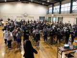 6年生と無門さんたちとの交流会 米づくり体験をさせていただいた無門さんたちと,交...
