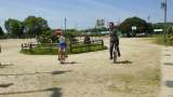 やまももタイムの運動場 その1 河合先生、一輪車上手! 大縄跳びも楽しそう。