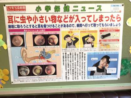 保健室の廊下の掲示板には耳についての記事がタイムリーに掲示してあります。順番を待つ子ども達が興味深そうに読んでいました。