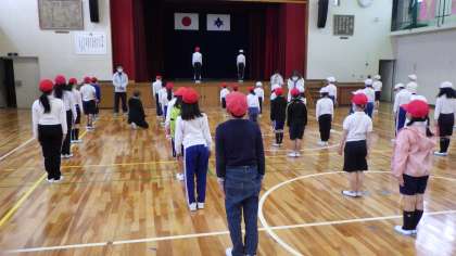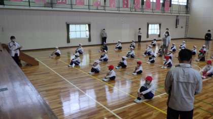 今日から運動会練習が始まりました。雨が降っていたので体育館で行いました。集団の動きや行進、かけあしの練習をしました。