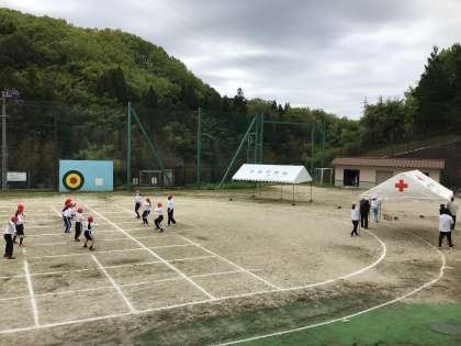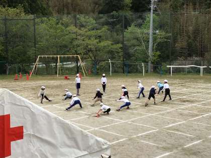 幸海小学校では、毎年、高学年はソーランの発表をしているのですが、先輩から競技への姿勢や技が見事に引き継がれているのです。6年生がリーダーとなって2つのグループに分かれ、4・5年生に動きの手本を見せていました。その横では、担任の先生方がテントを3張りも立てながら、横目で子どもたちの様子を見守っています。