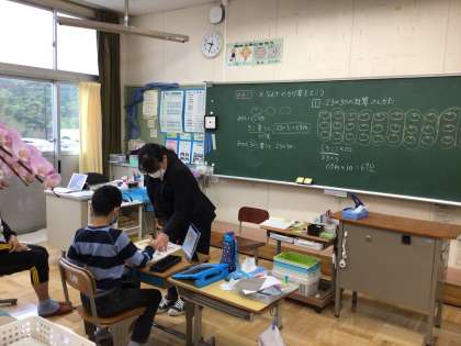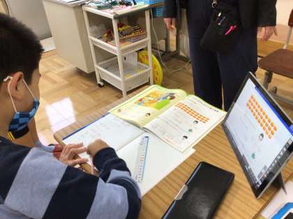 さちのみでは、かけ算の筆算の学習をしました。位に気をつけながら、順序よく計算しました。ノートにていねいにまとめる力もついていますね。タブレットを使いこなしているのもさすがです。