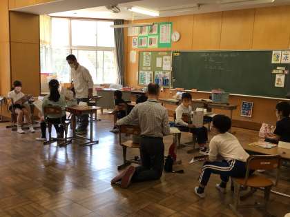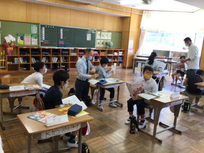 ブライアンさと一緒に英語の勉強する5年生。好きな色や好きなスポーツ、好きな食べ物をペアになって尋ねました。