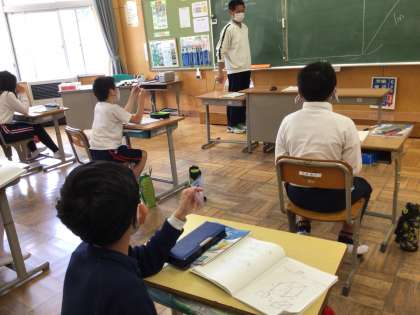 5年生の算数の学習では、1立方メートルの立方体の中に、1立方センチメートルがいくつ入るのかという学習をしました。ぎっしり入るの?という子どもたち。すきまなくだよ、カランカランとはいわないよという先生。イメージをもつと、既習事項を使ってじっくり考え始めた子どもたちでした。