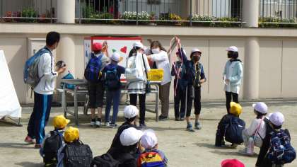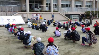 「春のふるさと探し」の出発です。校長先生や担当の先生の話を聞き、ビブスの色をくじ引きで決めて出発です。どんな発見があるか楽しみです。