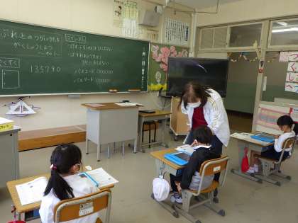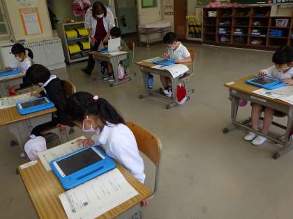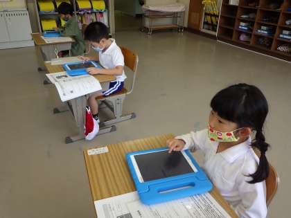 1年生は今日初めてタブレットに自分のパスワードを入力しました。「担任の先生方から、これは大事な数字だから、誰にも教えないでね」と言われ、慎重に一つ一つの数字を丁寧に押す子どもたちでした。5月下旬には家庭に持ち帰る予定です。