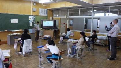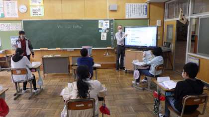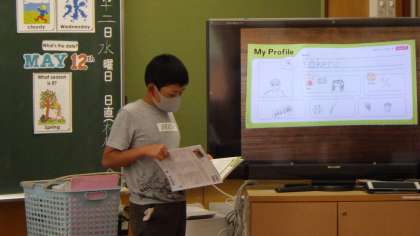 6年生の英語の授業です。ALTの先生の発音聞き、練習をしています。また、英語で好きなものについて発表しています。