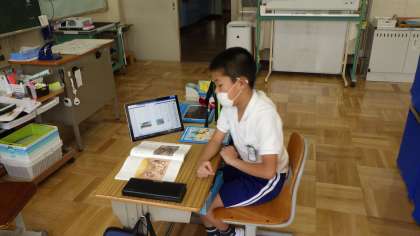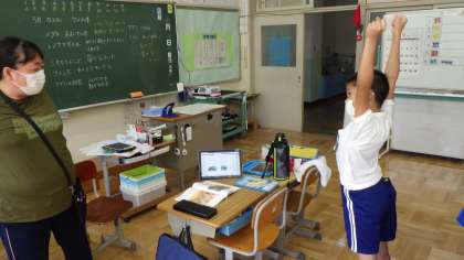 デジタル教科書を使った国語の授業です。途中、気分転換にストレッチをして、授業に全集中です。