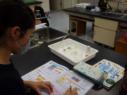 5年生の理科の授業では、インゲンマメの中に養分が入っているのか確認しました。