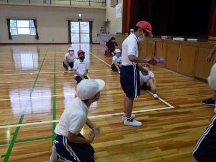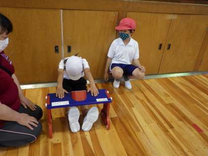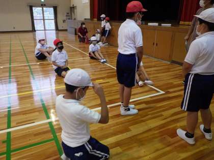 「気をつけをして、ぐっと力を入れて、記録を確認するよ」と先生から手順を教えてもらい、思いっきり頑張る子供たちでした。