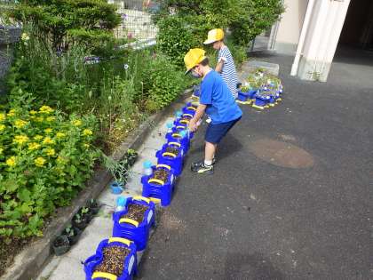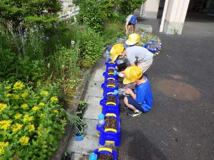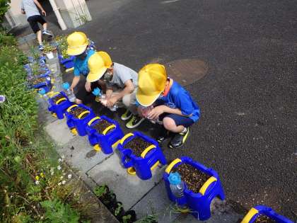 植えたばかりの朝顔の水やりをしたいからです。たっぷりお水をあげながら、大きくなってねとお祈りしていました。こことこことここと・・・と5つ蒔いたことを教えてくれました。芽が出てきた時の子どもたちのうれしそうな顔を思い浮かべました。