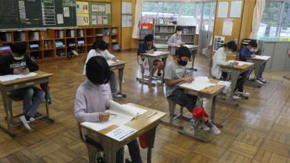 1時間目に国語の問題を解きました。長い問題文を一生懸命読んで、解いていました。