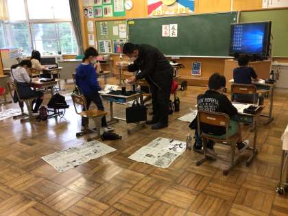 基本は、一。角度をつけて筆を入れ、最後は筆を少し上げて、すっとぬきます。これが一番難しいのです。何度も真似て練習する子供たちでした。