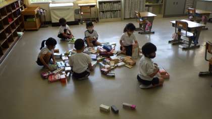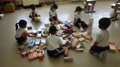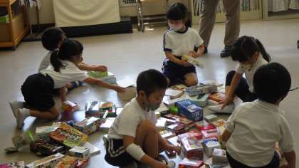 みんなが家から持ってきた空き箱を使って、動物や乗り物を作りました。