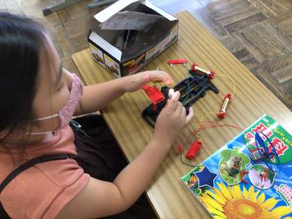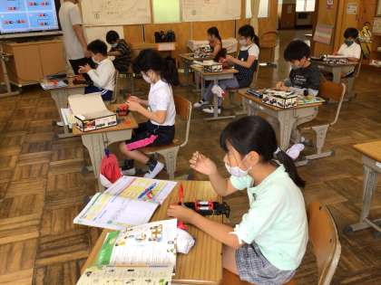 もっと明るくするにはどうしたらいいんだろう?乾電池のつなぎ方を繰り返し確かめる中で、回路の仕組みを学びました。問いをもちながら、試行錯誤し、結論を導き出す学習を大切にしています。