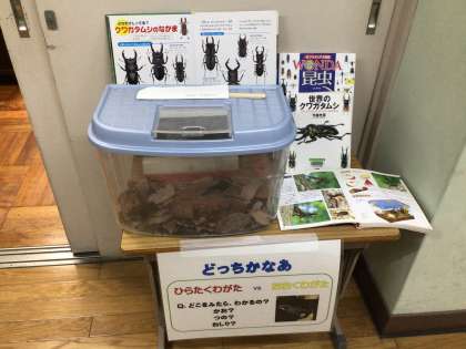 どこを見たらわかるでしょう?と挑戦状?を出したところ、やはり、みんなヒラタクワガタだと答えました。簡単だったかな。近くに図書を置いたら、メスは小さいねとか、大きさが書いてあるよと口々に資料を読み取り始めました。何冊もの資料を見比べる子もいます。図鑑にも興味をもってくれたかな。