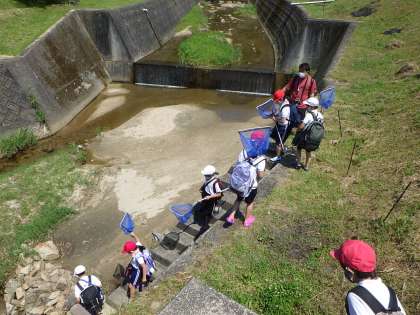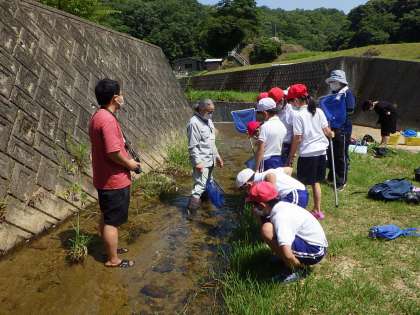 到着するまで、水分補給タイムで2回お茶を飲みました。途中で地域の方にお会いし、「前はここらもホタルが見られたけどな。大曲のカーブでホタルが見られるよ。」と教えていただきました。到着するとすぐに、山内さんが生物の調査の仕方を説明してくださいました。近くで、草刈りをしていらっしゃった地域の方が、「うちの高校生の娘も小学生の時に川に行ってから、時々生き物を採ってきて、飼ってたよ。」と教えてくださいました。地域の皆さんが温かく子供たちを見守ってくださっていることが分かります。