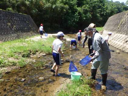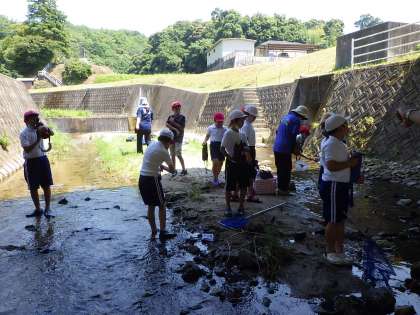 川でも、給水タイムをとりながら、日陰で休みました。でも、子供たちは、早くやりたくて仕方がない様子。保健の先生がWBGTを測定したところ、安全に活動できる値でした。第2回戦 GO!です。