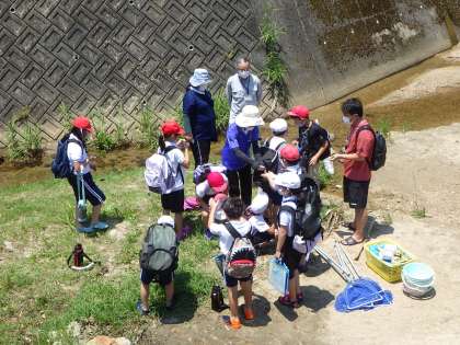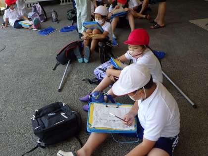 帰り道の前に、みんなで塩分タブレットを口に入れました。タブレットをすぐかんじゃう子といつまでも口の中に入っている子といて、そんなことでも、笑いながら帰りました。学校に着いてからは、調査の結果を評価しました。見つかった生き物の数から川はきれい、ややきれいという結果になりました。