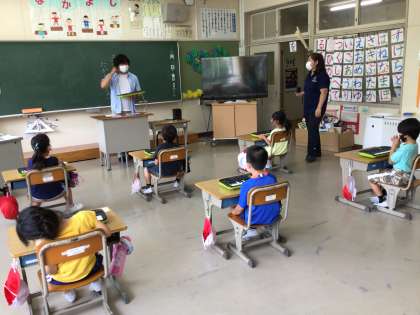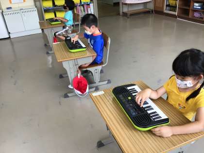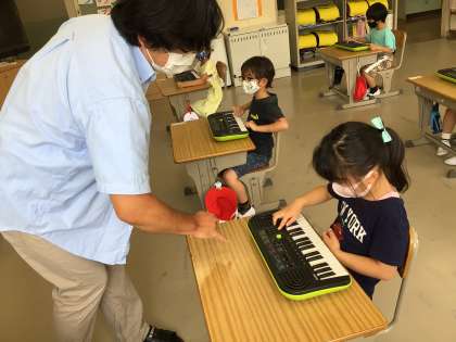 コロナウイルスへの対策として、いくつかの学習内容の変更があります。特に音楽では、歌唱やリコーダー、鍵盤ハーモニカの制限があります。今日は1年生の子供たちのために、音楽講師さんがキーボード操作を教えに来てくださいました。ボタンを押すだけで波の音や機関車の音、太鼓の音、宇宙の電波?のような音が鳴り出すのが面白くて、次々と楽しみました。音楽の楽しさを工夫しながら味わわせています。