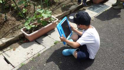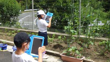 育てている野菜の生長を記録しました。タブレットで写真を撮って、発表ノートに張り付けて、タブレットで提出します。