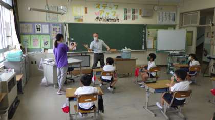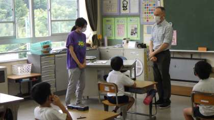ALTの先生と一緒に、あいさつを英語で練習しました。