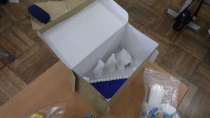図工で箱の中にいろいろな世界を紙粘土などを使って作り上げ、箱にあけた穴からのぞく、作品を作っています。
